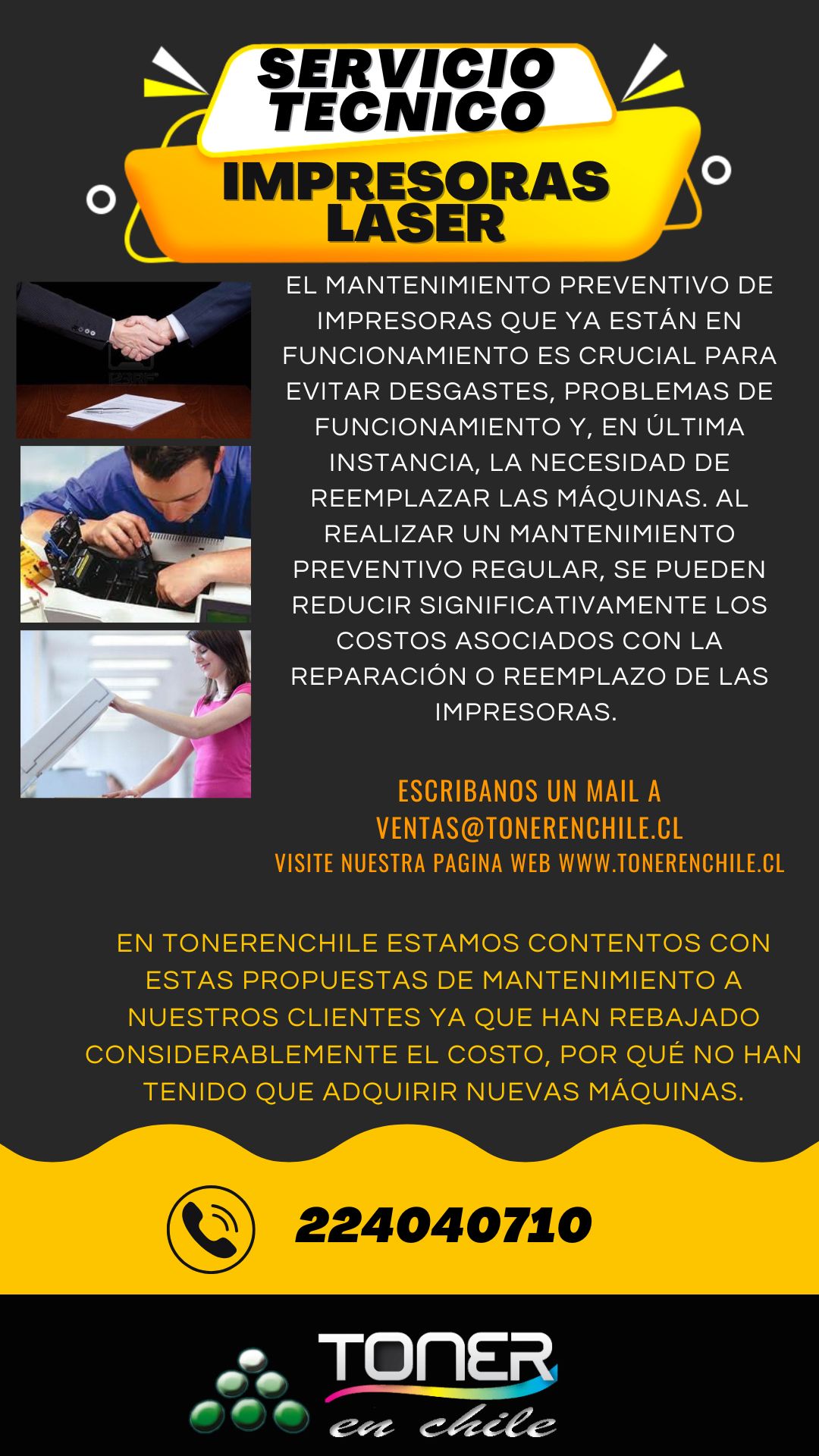 Requiere una visita técnica con un costo de 1 UF + IVA (hasta 3 impresoras). La evaluación se realizará en terreno y, si es necesario, se solicitará autorización para trasladar el equipo a nuestro laboratorio. Posteriormente, se enviará un presupuesto y, de ser aceptado, se procederá con la reparación.